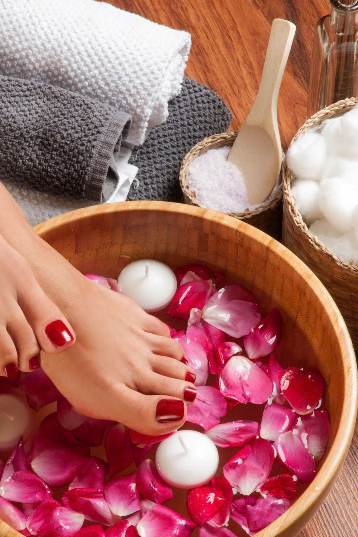 We use organic products, mineral salt soak, nail and cuticle care, callus remover, sugar scrub, mask, hot towels, and foot massage with essential CANDLE OIL to make the skin glow and feel as smooth as butter. We also use paraffin wax and finish by applying lotion to keep the skin moisturized, along with adding regular polish.